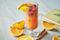 Все сухие ингредиенты тщательно измельчи в ступке или просто разотри скалкой, пересыпь в стакан, добавь дольку лайма и апельсина, залей апельсиновым соком. Нагрей смесь до комфортной температуры, не доводя до кипения. Подавай пунш горячим.